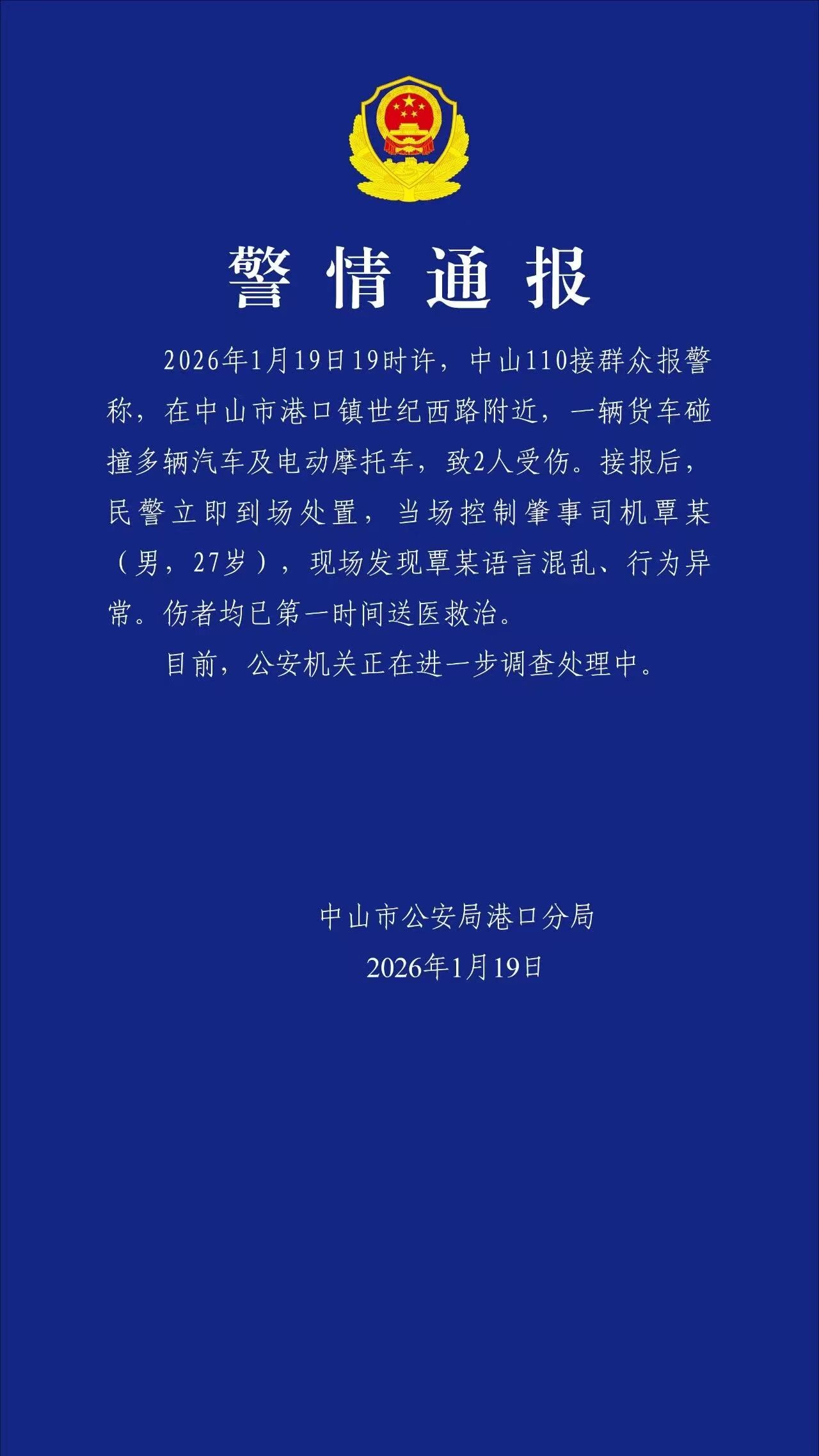 2026年1月19日19时许,中山110接群众报警称,在中山市港口镇世纪西路附近,一辆货车碰撞多辆汽车及电动摩托车,致2人受伤。接报后,民警立即到场处置,当场控制肇事司机覃某(男,27岁),现场发现覃某语言混乱、行为异常。伤者均已第一时间送医救治。